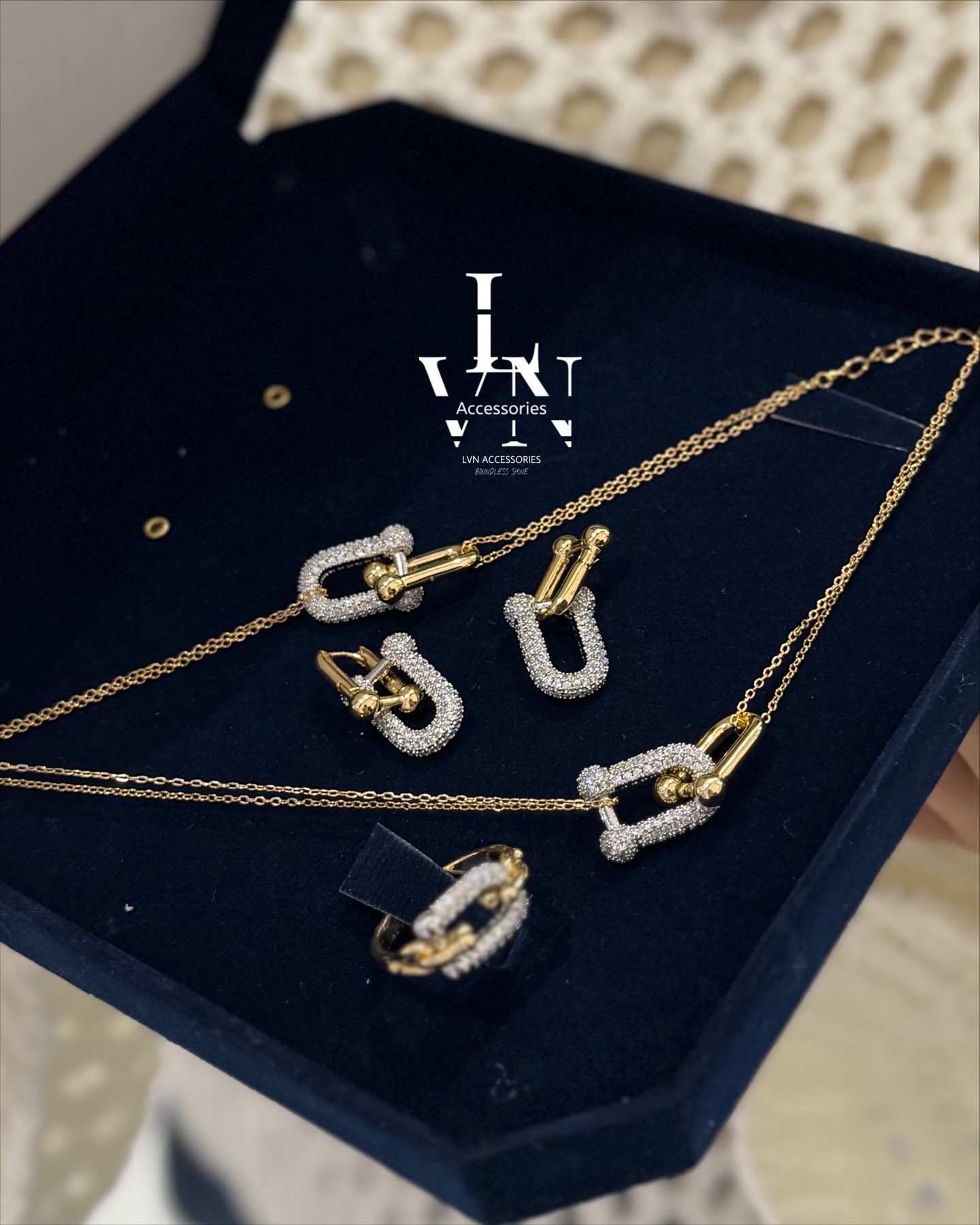 سرویس کامل تیفانی طرح طلا شامل دستبند و گردنبند و گوشواره و انگشتر می باشد آبکاری طلای ۱۸ عیار انگشتر سایز بندی و فری سایز هم داره نگین ها تمام مخراجکاری شده